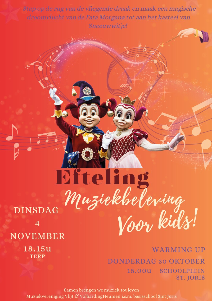 Terp Heumen Dorpstraat 21, HeumenSamen brengen we muziek tot leven! Speciaal voor alle kinderen uit Heumen… Dinsdag 4 november om 18.15 geven we een wervelende Efteling-show voor alle kinderen uit Heumen (natuurlijk zijn ouders en grootouders ook welkom!). Ontmoet Roodkapje, draai rond in de Vila Volta, klim op de rug van de vliegende draak en vlieg mee naar het …
